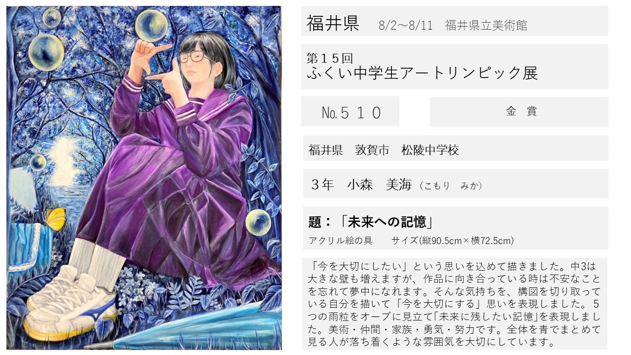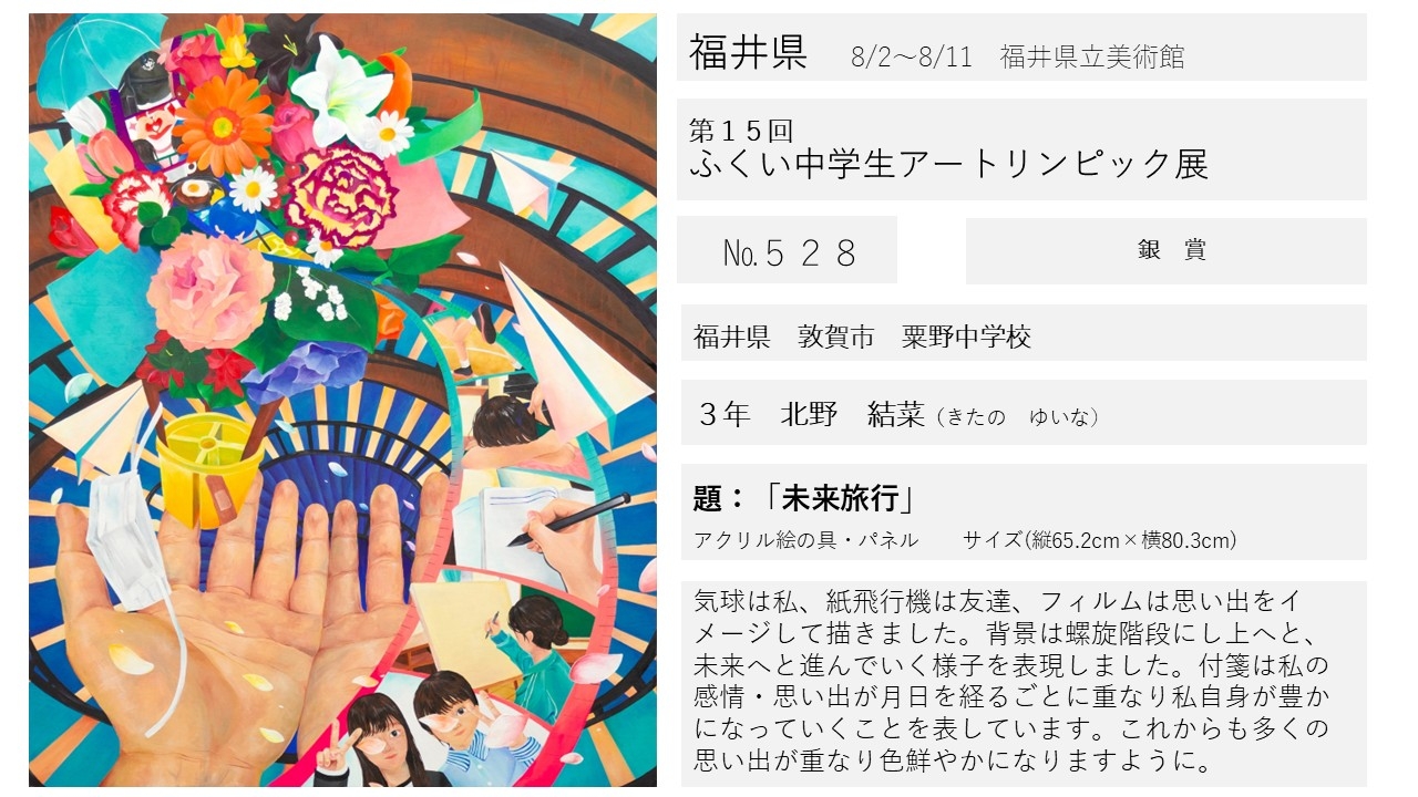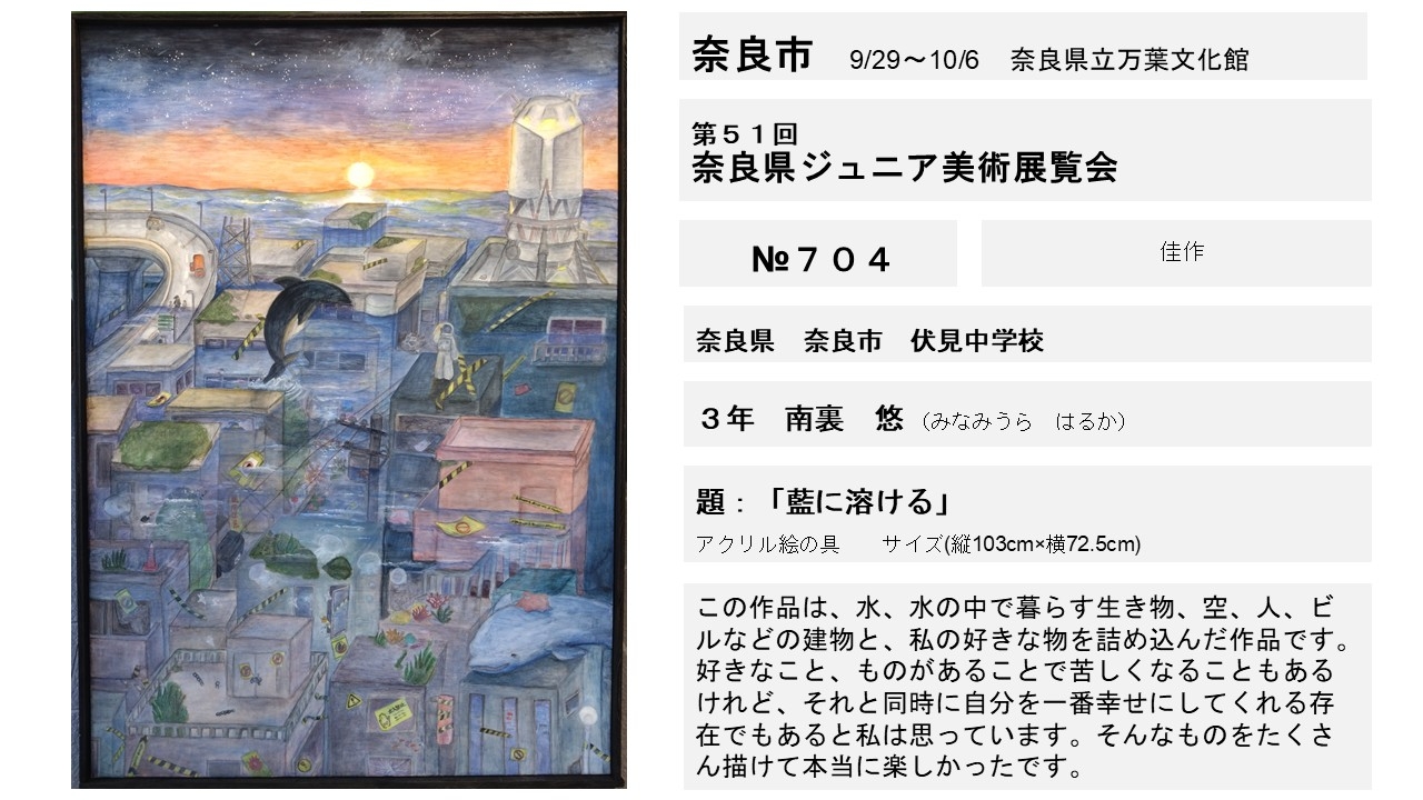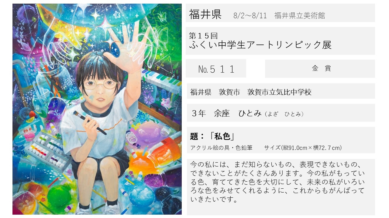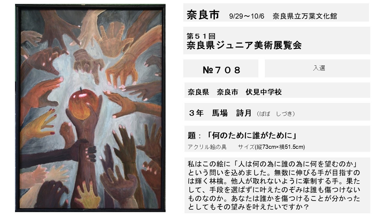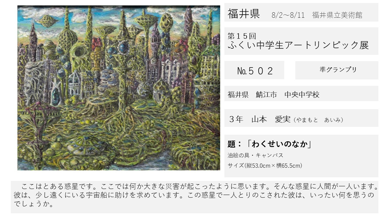 ・作品画像をクリックすると、どのような思いで描いたのか、作品解説を読むことができます。また、作品サイズや画材なども参考にしてください。作品や解説などから、よいと思う作品にいいね投票をお願いします。